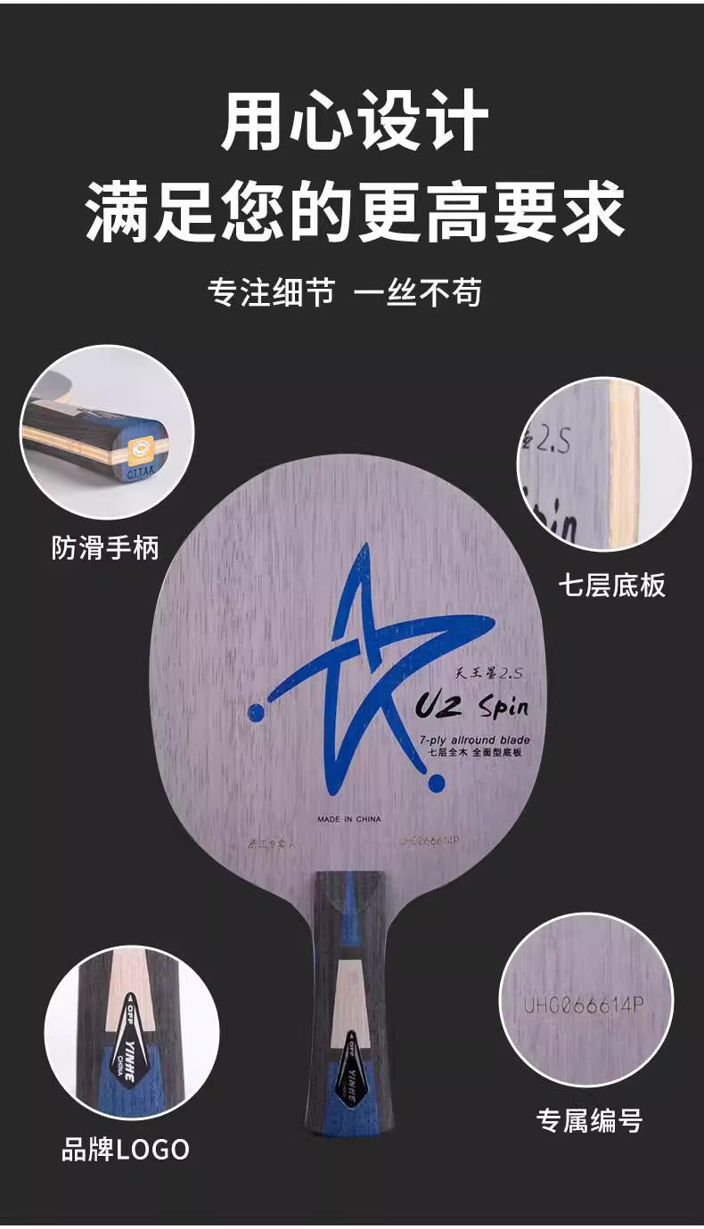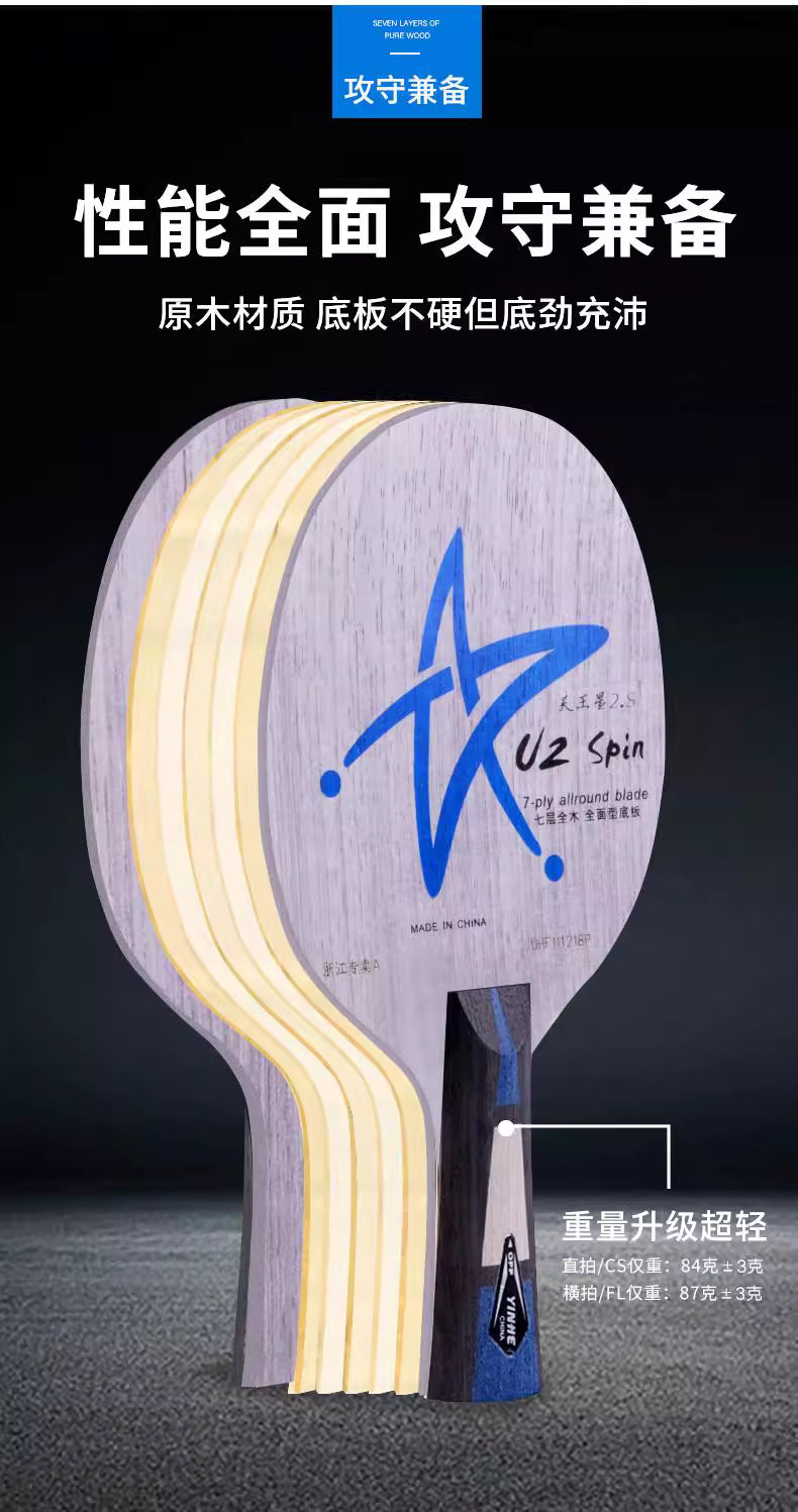 U-2S is an optimized evolution of Yinhe’s best-selling U-2 seven-ply blade. The structure has been softened and fine-tuned to improve control and ease of handling, while further expanding the effective sweet spot for more forgiving and consistent contact.